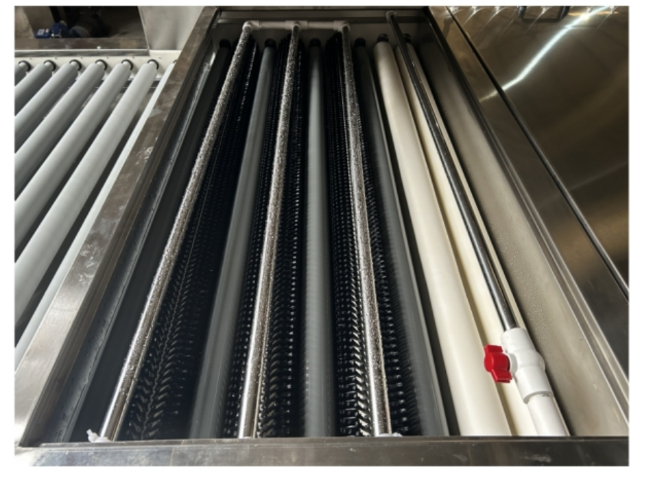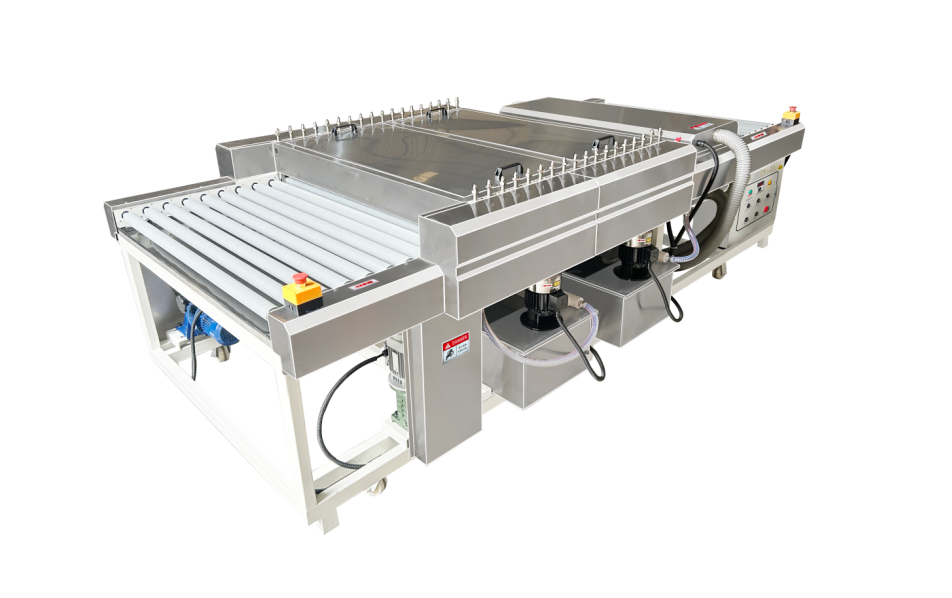 5.清洗段 整機輸送膠輥采用丁晴膠鑄膠材質、45#鋼軸芯結構;清洗室共5組尼龍毛刷(毛刷外徑80mm),分別由上下一組毛刷電機帶動鏈條傳動順時針方向清洗;風干段采用6組進口吸水綿,上下壓縮玻璃表面來達到吸干明水;