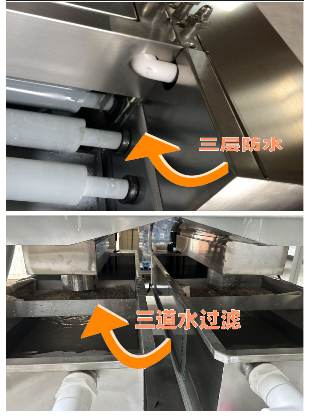 4.整機采用兩級清洗,兩組水箱,一組烤箱;三層防水,三道水過濾,水接觸部位鈑金全部為不銹鋼材料制造;